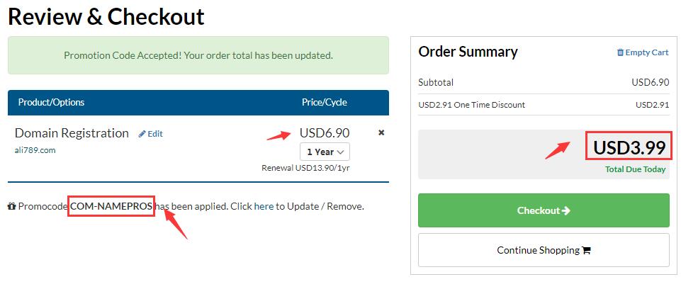 此次又发布了一个.com新注册3.99美元/首年(25元左右)的优惠码:COM-NAMEPROS,新老客户都可以使用,具体一个用户能否多次使用,这个站长未知,没有测试,亲测老用户是可以使用的。优惠码到期时间也未知,需要域名的朋友可以考虑此商家。