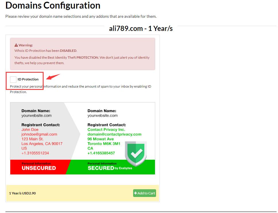 注册域名时在下面页面一定要取消“ID Protection”,不然就要多2.9美元。