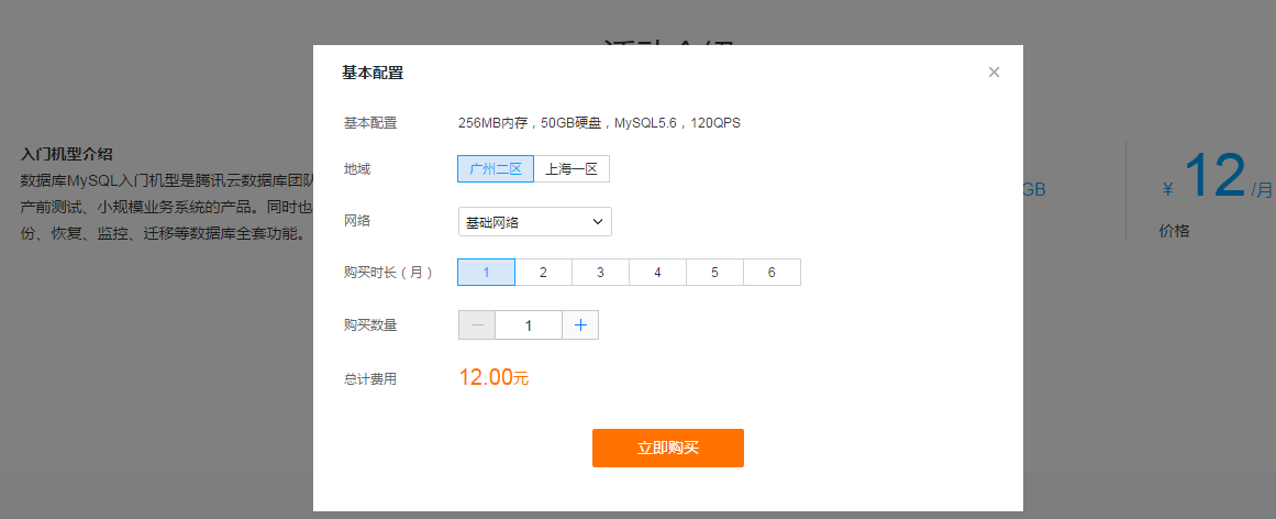 1、点击进入腾讯云云数据库MySQL入门机型活动页面,并点击立即购买按钮进入如下图页面。