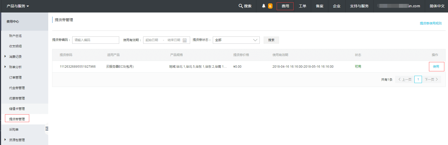 1、登陆自己参与过“阿里云推荐有礼”活动的账号,然后点击费用,再点击提货券管理就可以查看到自己的云服务器提货券了。
