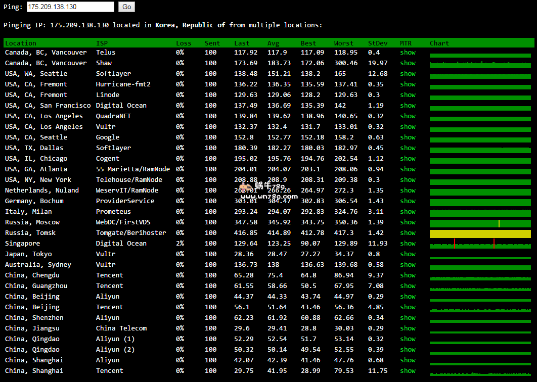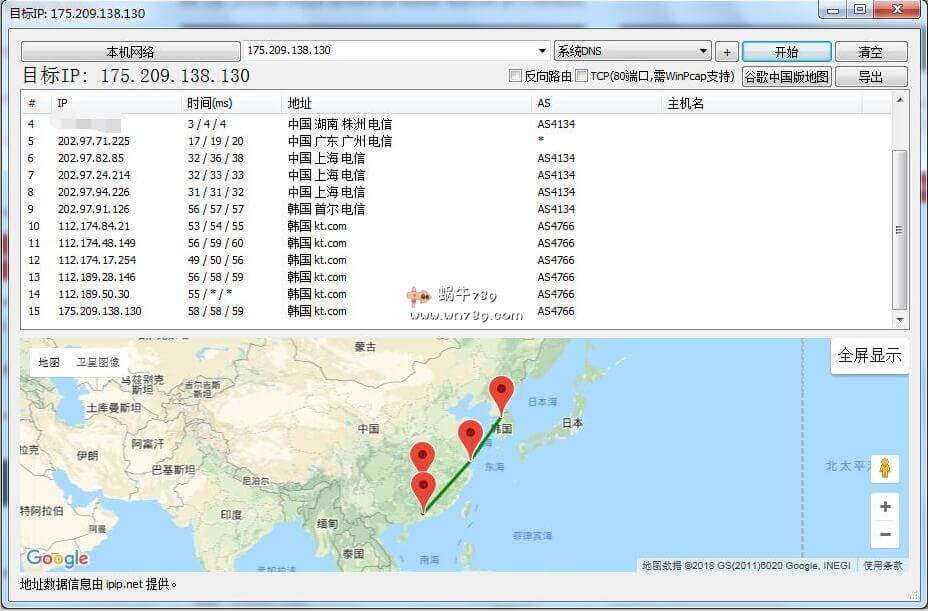 | 22 | 175.209.138.130 | 175.209.138.130 | 韩国 kt.com | AS4766 | 130.9 / 128.6 / 128 |