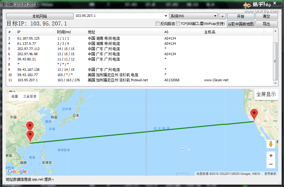 | 11 | 59.43.189.34 | 59.43.189.34 | 美国加利福尼亚州洛杉矶 电信 | 153.6 / 153.9 / 153.3 | |