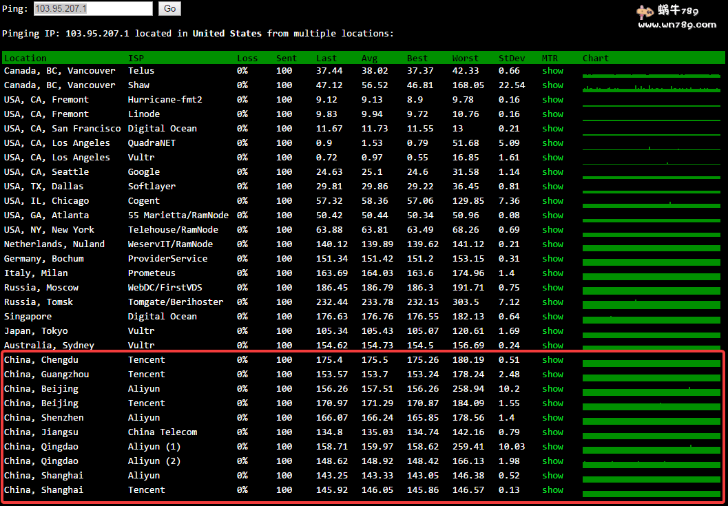 | 1 | 103.24.228.1 | 103.24.228.1 | 天津 cnkuai.cn 联通 | AS4837 | 3.1 / 0.7 / 0.8 |