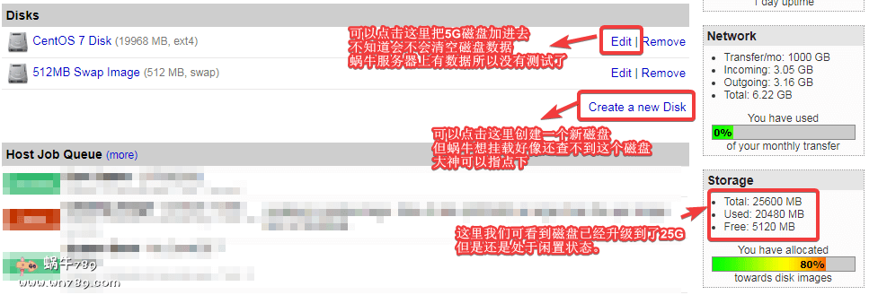 6、升级完成我们可以看到磁盘增加了5G,因为站长是1核1G内存的配置。升级完成后磁盘是闲置的,我们需要自己添加使用,具体可以看下图,站长已经标注了如何使用。
