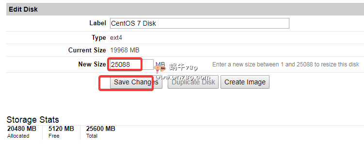 7、如果是要添加到已经使用的磁盘当中去也是可以的,我们点击上图当中的“Edit”进入到如下图页面,按下图操作即可。但是需要关机VPS才能修改磁盘的哦。另外增加磁盘不会清空数据,站长已经亲测,但是添加前还是做好备份吧。