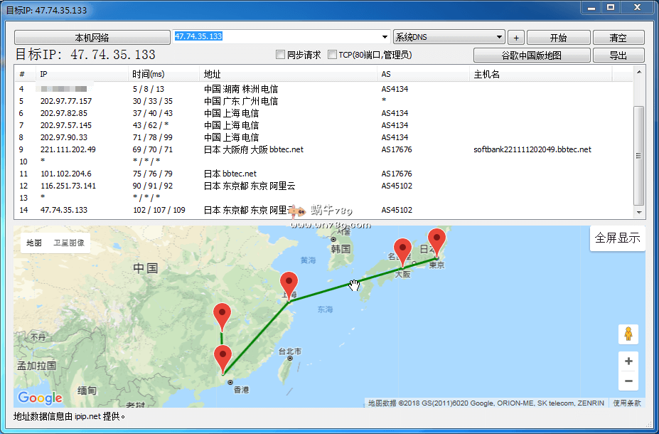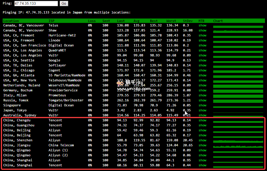| 14 | 47.74.35.133 | 47.74.35.133 | 日本东京都东京 阿里云 | AS45102 | 79.7 / 80.1 / 79.4 |
