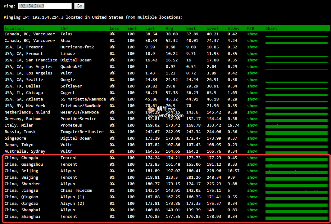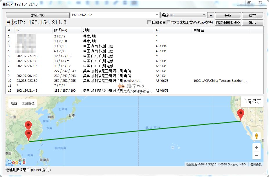 | 9 | 219.158.103.2 | 219.158.103.2 | 美国加利福尼亚州洛杉矶 联通 | AS4837 | 189.3 / 186.5 / 186.9 |