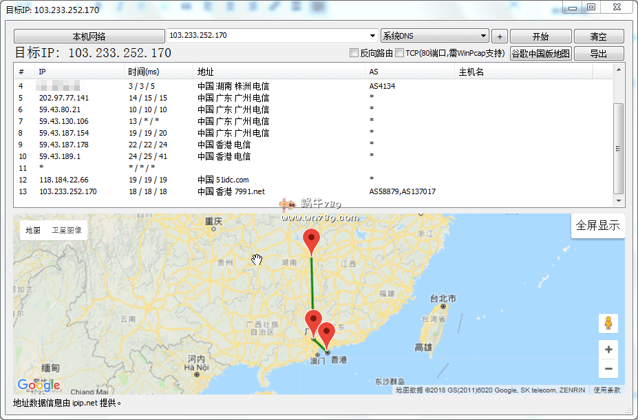 | 13 | 59.43.250.174 | 59.43.250.174 | 香港 电信 | 47.5 / 47.2 / 83.3 | |