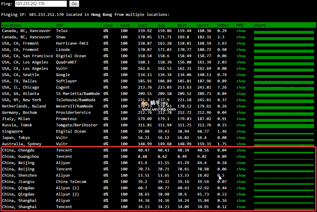 | 15 | 115.160.187.110 | 115.160.187.110 | 香港 wtthk.com.hk | AS9381 | 39.2 / 40.1 / 39.2 |