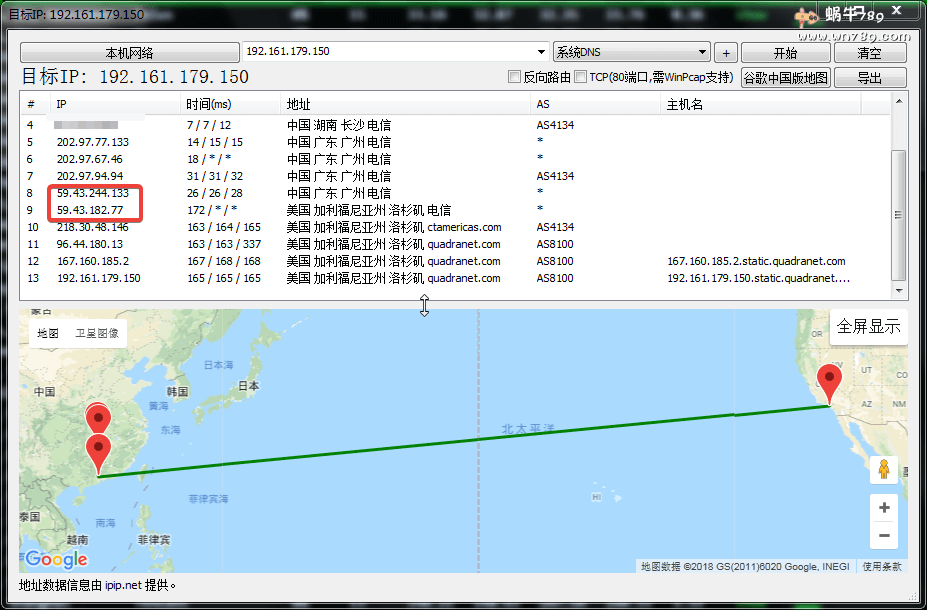 | 19 | 192.161.179.150 | 192.161.179.150 | 美国加利福尼亚州洛杉矶 quadranet.com | AS8100 | 172.9 / 170.2 / 162.7 |