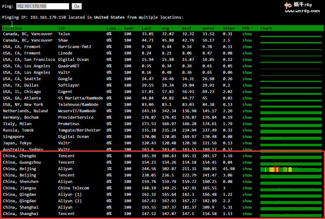 | 8 | 219.158.104.10 | 219.158.104.10 | 美国加利福尼亚州洛杉矶 联通 | AS4837 | 180.8 / 180.9 / 180 |