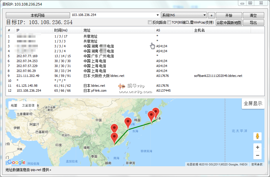 | 跳数 | IP | 主机名 | 地区(仅供参考) | AS号(仅供参考) | 时间(毫秒) |