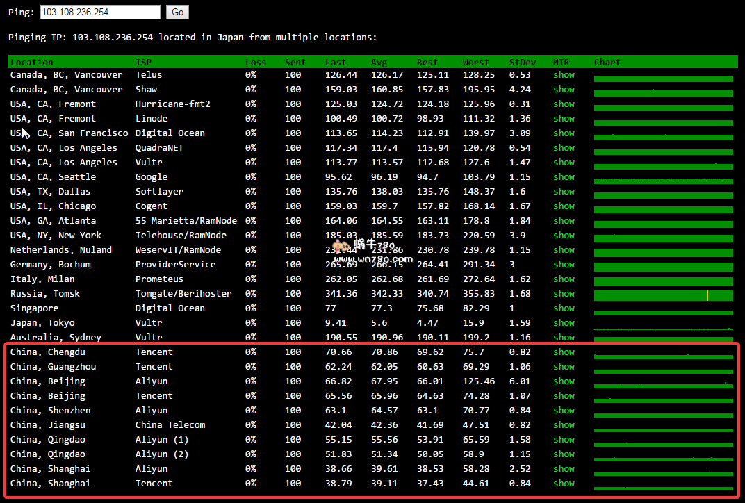 | 11 | 103.108.236.254 | 103.108.236.254 | 日本 pf-link.com | AS137445 | 53.7 / 54.3 / 53.8 |