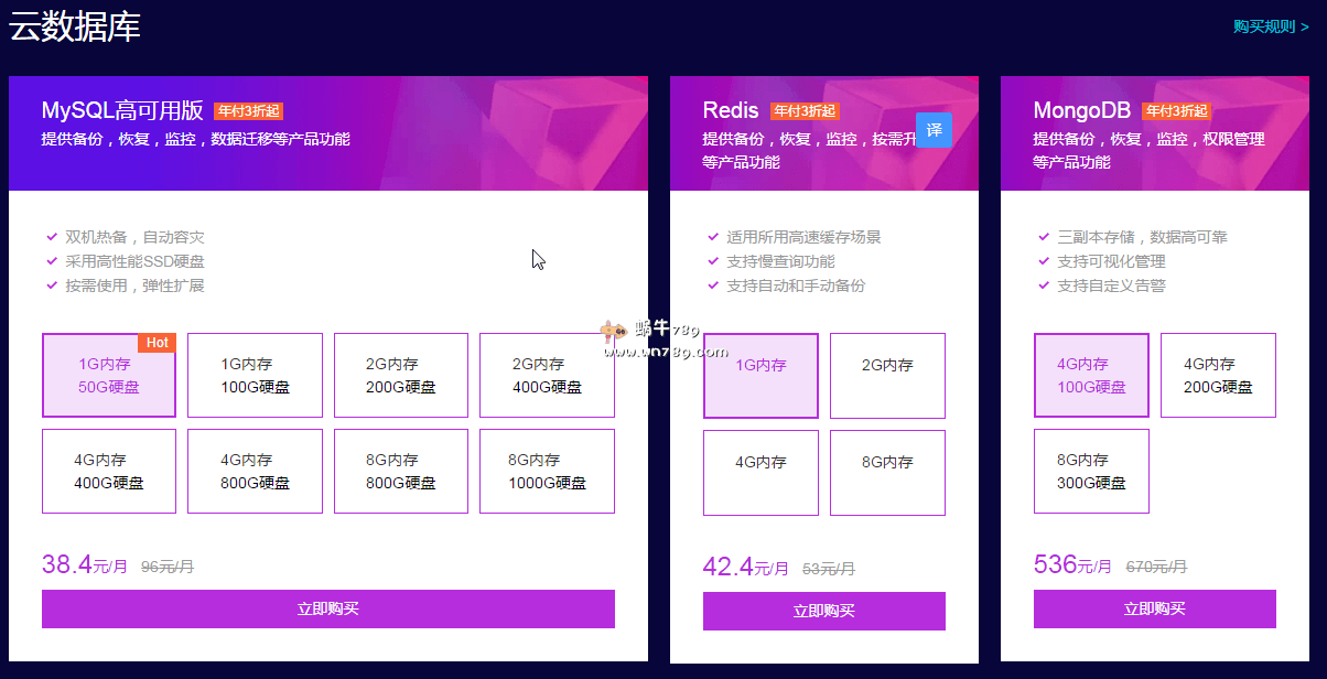 另外就是云数据库了,关于腾讯云的云数据库产品,站长也有亲自体验过(腾讯云云数据库MySQL入门机型256M内存/50G硬盘188元/3年),支持外网连接, 1G内存、50G硬盘年付300元多一点,3年也只需1000元左右。