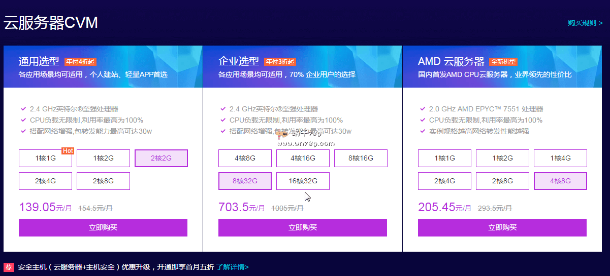 如果爆品秒杀没有选到合适的云服务器产品,可以看看促销云服务器CVM活动,同样有香港数据中心可以选择,配置从1核1G到16核32G可以选择,年付最低三个折。另外还有新上线而且价格相对较实惠的AMD云服务器可以选择,最高配置4核8G内存3年也只需4226元,平均只需1400多元/年,不过只有国内数据中心可以选择。