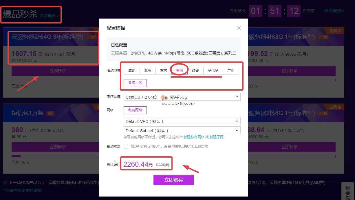 如果需要购买云服务器,那么一定要关注下腾讯云的爆品秒杀活动,现在基本每场秒杀活动都有2核4G内存的云服务器方案,最低3年只需1607.15元。并且有香港、硅谷、多伦多等节点可以选择,如果是稳定建站使用那么最佳选择是香港数据中心,2核4G内存方案3年也只需2260.44元。