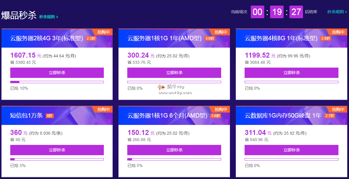 每天09:00、11:00、14:00、16:00、19:00五场秒杀活动,基本都有2核4G内存配置方案可以选择。