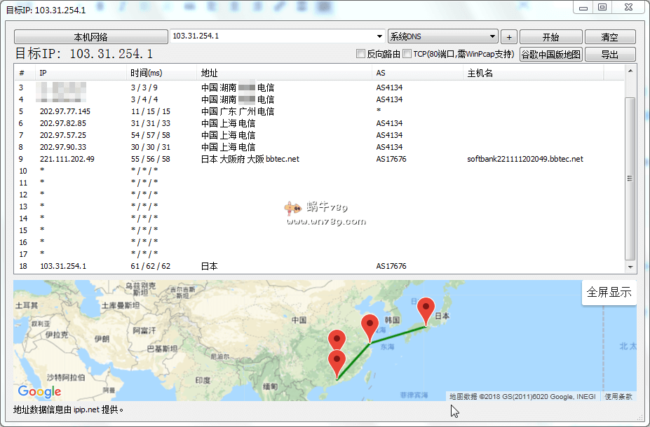| 跳数 | IP | 主机名 | 地区(仅供参考) | AS号(仅供参考) | 时间(毫秒) |