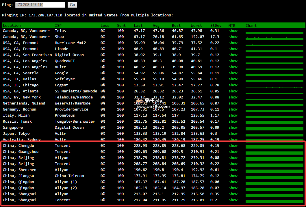 | 10 | 219.158.116.234 | 219.158.116.234 | 美国加利福尼亚州圣何塞 联通 | AS4837 | 201.1 / 198.8 / 204.4 |