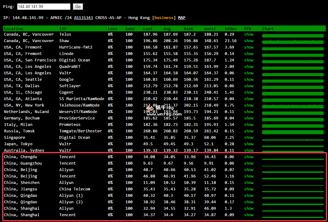 | 11 | 115.160.187.109 | 115.160.187.109 | 香港 wtthk.com | AS9381 | 30.6 / 30.4 / 27.7 |