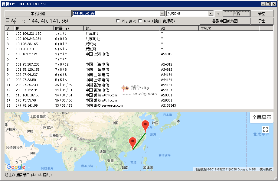 | 跳数 | IP | 主机名 | 地区(仅供参考) | AS号(仅供参考) | 时间(毫秒) |