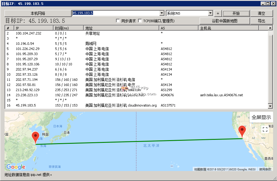 | 16 | 45.199.183.5 | 45.199.183.5 | 美国加利福尼亚州洛杉矶 cloudinnovation.org | AS137571 | 211.1 / 213.9 / 217.6 |