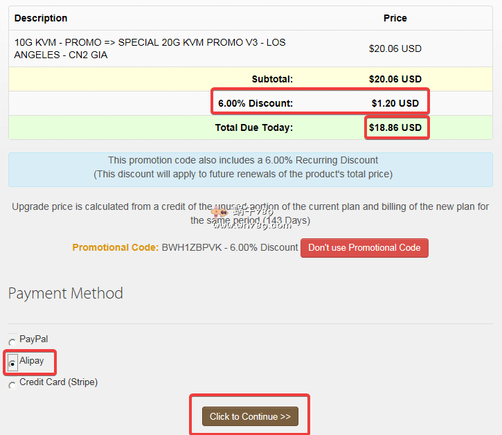 4、下面是升级付款页面,如果你购买VPS使用了终身优惠的优惠码,升级时会自动添加,升级会按你现有套餐到期的天数计算升级的费用。站长教程中升级的方案还是143天到期,那么升级的费用等于,升级套餐的143天的费用减去原有套餐143天的费用就是升级需要支付的费用。不了解清楚也没关系,高品质美国CN2没有乱收你一分钱,都是实打实计算的。