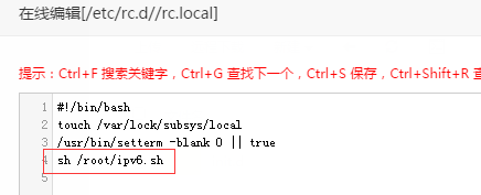 3、创建开机启动IPv6。执行下面命令。编辑rc.local在最后面添加“sh /root/ipv6.sh”,添加完后和上面一样按Esc,输入:wq保存退出。
