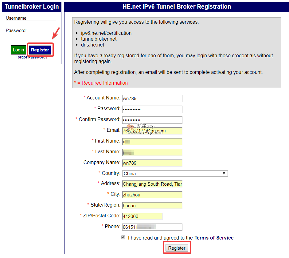 1、下面首先说下如何IPv6申请,这里我们利用tunnelbroker.net申请免费的IPv6地址。首先我们点击这里打开注册一个账号,按下图注册一个账号。