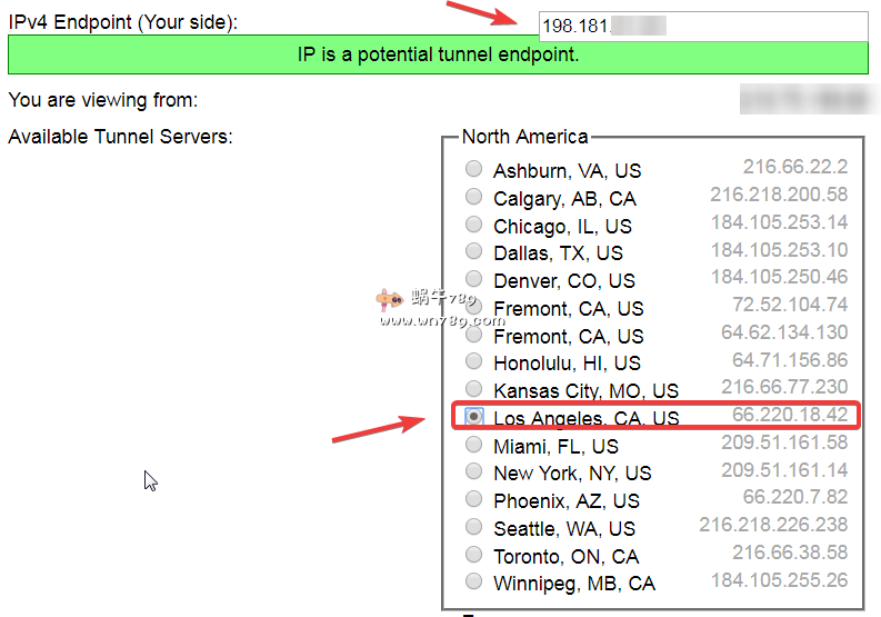 3、然后如下图,在第一个红框位置填写你要申请VPS的IP,第二个红框是选择VPS所在地,站长申请的事洛杉矶数据中心。