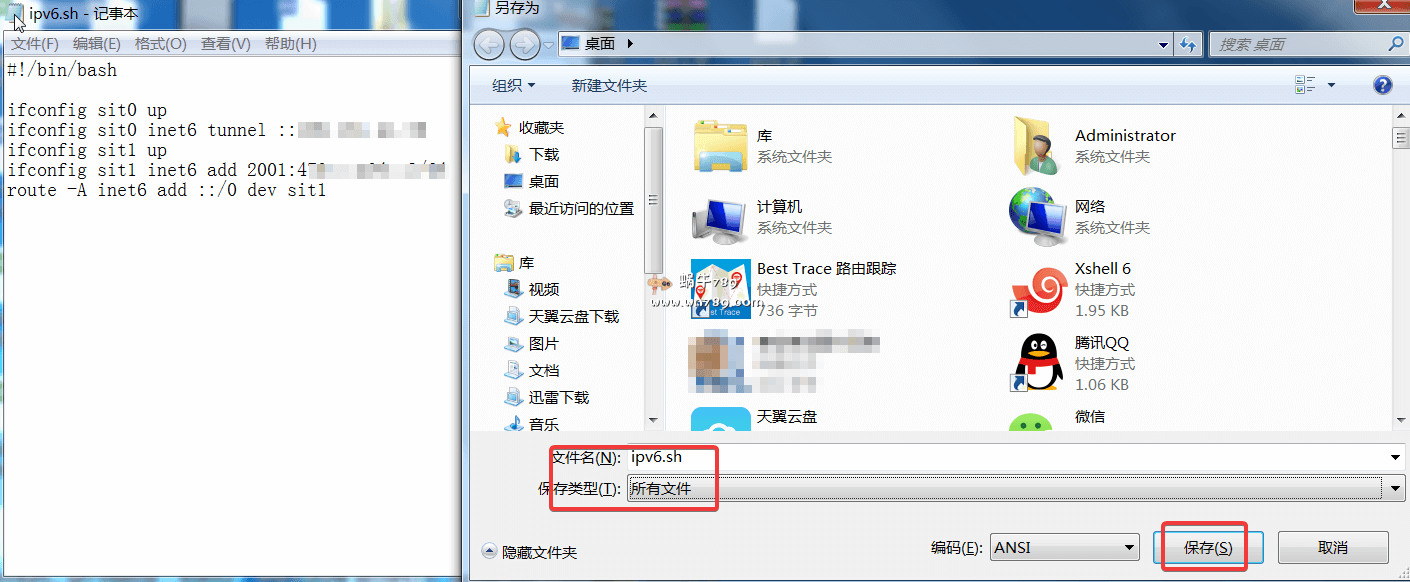 2、这一步是设置开机启动。我们先新建一个文本文档,然后把下面命令复制到文本内,并另存为“ipv6.sh”。这里千万别直接复制站长的内容,“#!/bin/bash”下面的内容其实就是申请免费IPv6后得到的配置命令,米复制你自己的吧,但一定记得加#!/bin/bash。然后把文件上传到/root/目录。