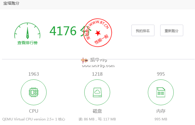 1、首先来一个宝塔跑分。测试显示是虚拟CPU不用过于担心,是KVM架构下的一种显示方式。站长开通的是1核1G内存的配置,宝塔跑分是4176分。
