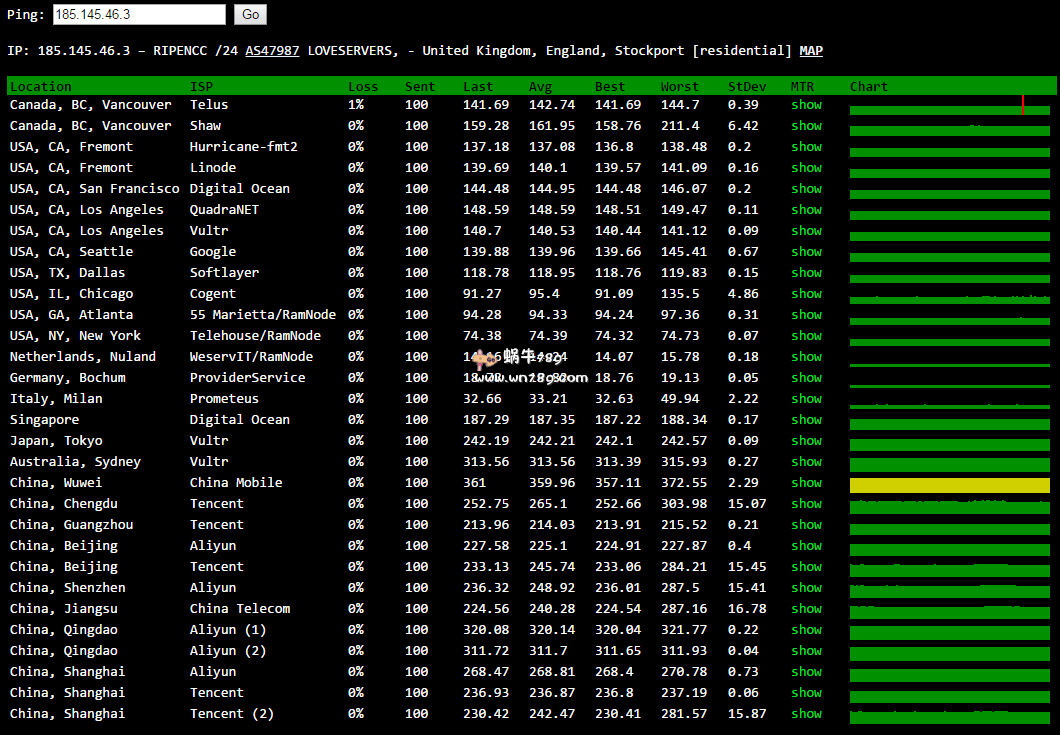 | 19 | 185.145.46.3 | 185.145.46.3 | 英国大曼彻斯特郡曼彻斯特 loveservers.com | AS47987 | 216.5 / 212.8 / 214.1 |