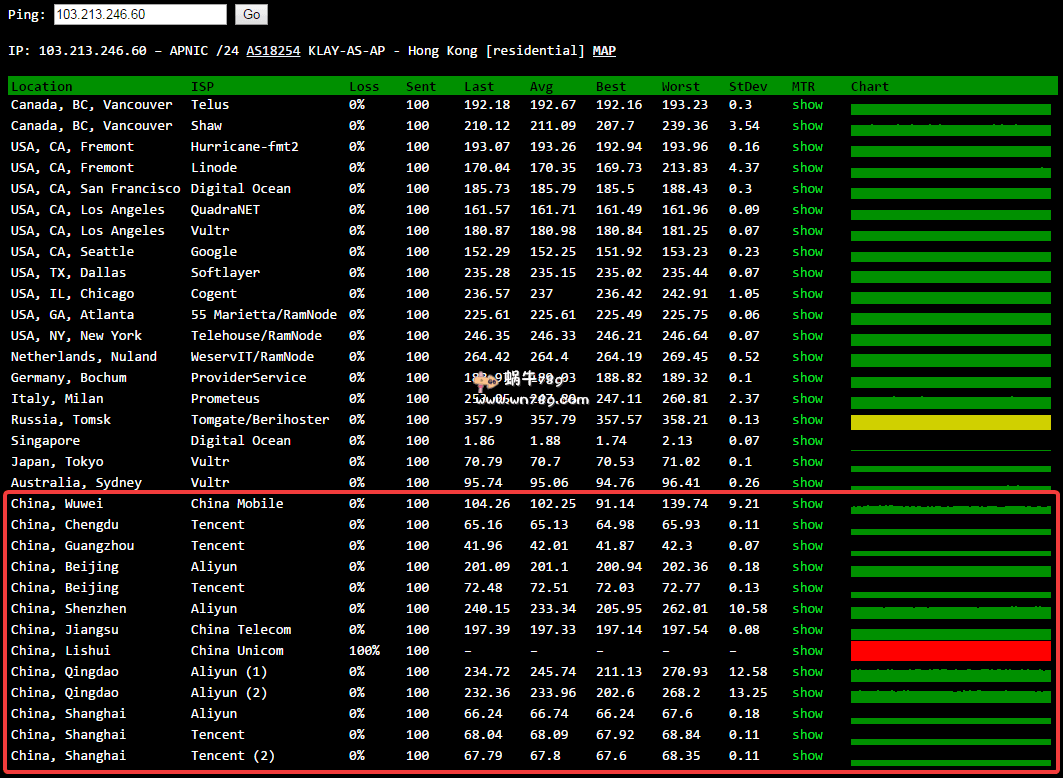 | 21 | 103.213.246.60 | 103.213.246.60.Singapore.asia.klayer.com | 新加坡 klayer.com | AS18254 | 82.1 / 76.6 / 75.7 |
