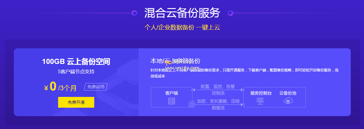 3、混合云备份免费试用活动。 活动时间内,新老用户可以免费试用“混合云备份客户端 5个节点3个月、混合云存储资源 100G 3个月”的混合云备份服务。