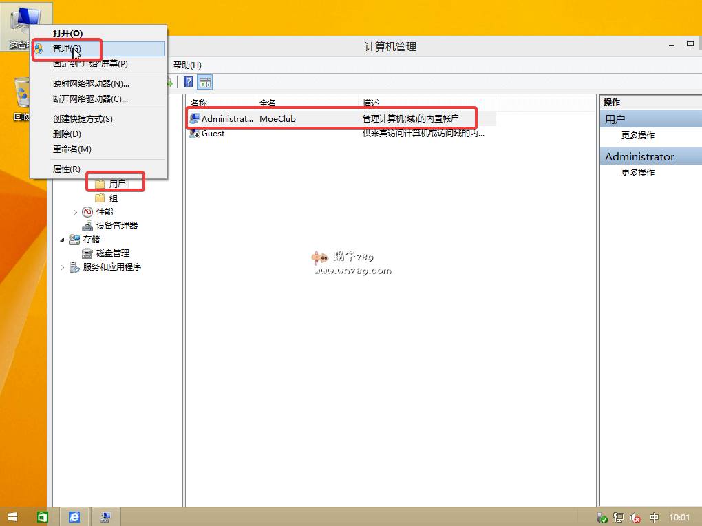 3、安装完成后的设置administrator用户密码,如下图,右键点击这台电脑,选择管理,然后选择用户组,再点击右键点击右侧红框位置,选择设置密码。