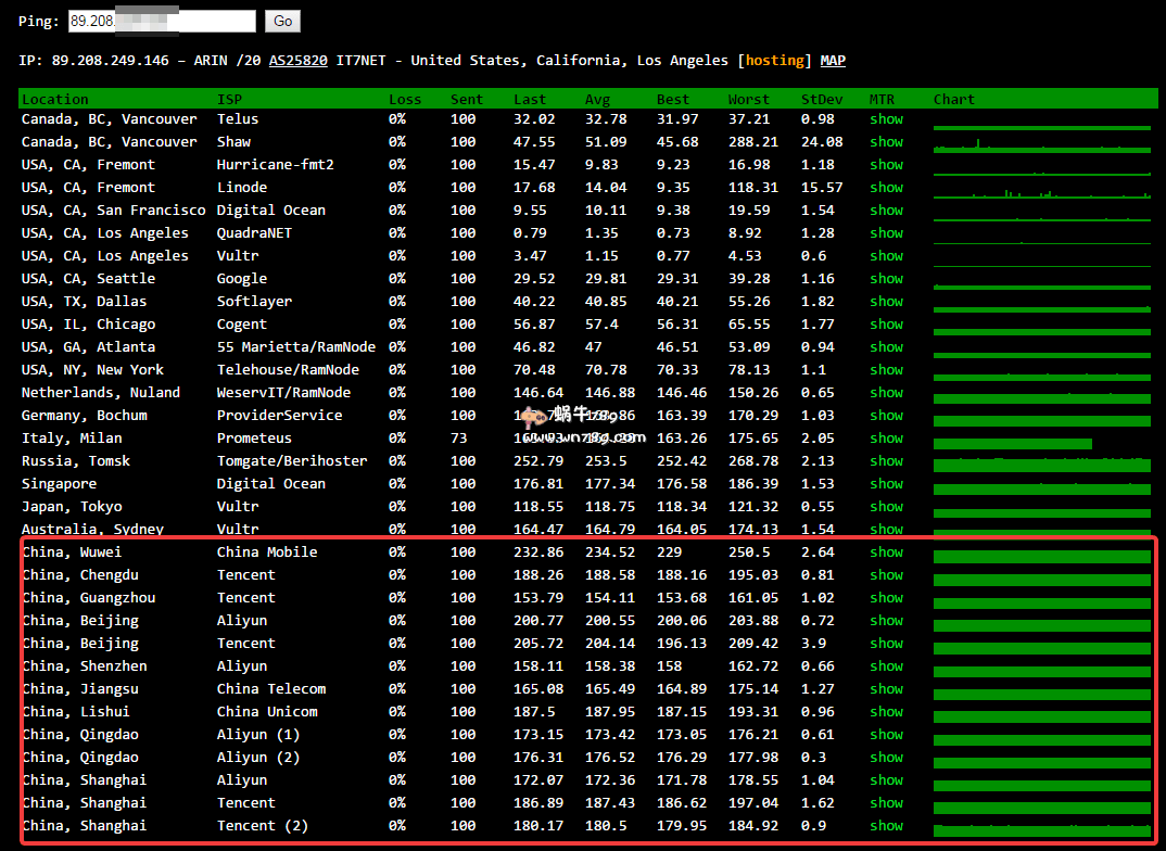 | 14 | 89.208.249.28 | 89.208.249.28.16clouds.com | 美国加利福尼亚州洛杉矶 it7.net | AS25820 | 185.5 / 185.5 / 185.3 |