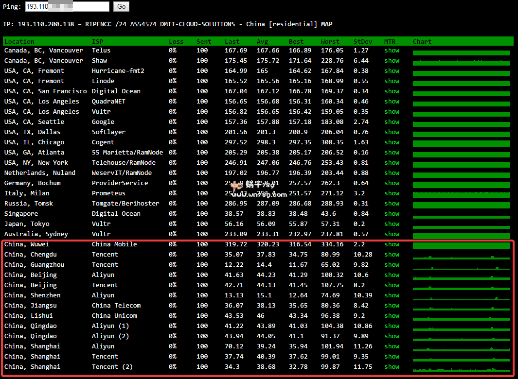 | 17 | 193.110.***.*** | 193.110.***.*** | 香港 dmit.io | AS54574 | 37.5 / 38.5 / 40.4 |