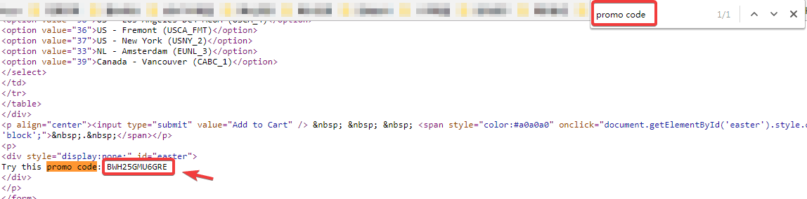 3、进入到网页源码查看页面后,使用Ctrl+F搜“promo code”,就可以看到最新可以使用的优惠码了。