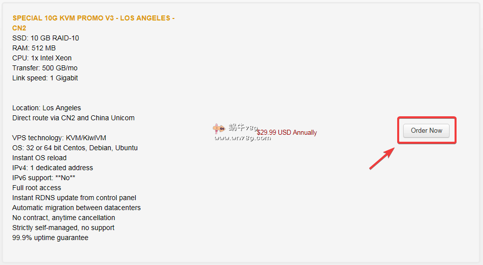 1、点击这里进入到高品质美国CN2官网,然后进入到产品购买页面,选择任意方案,点击如下图的“Order Now”进入到产品购买页面。也可以直接点击这里进入到产品购买页面。
