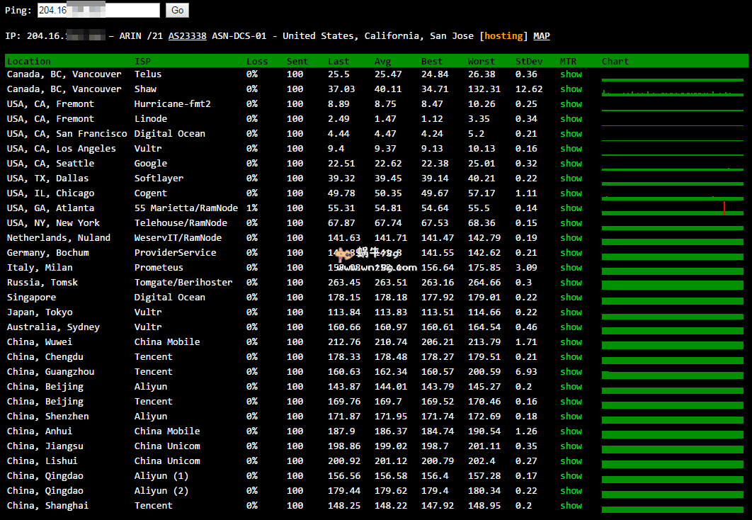 | 9 | 207.254.191.25 | 207.254.191.25 | 美国 chinaunicom.com | AS19174 | 164.9 / 164.5 / 174.1 |