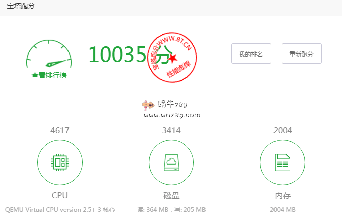 9、宝塔跑分测试。站长开通的事3核2G内存配置,CPU计算能力得分不错,建站使用毫无压力。