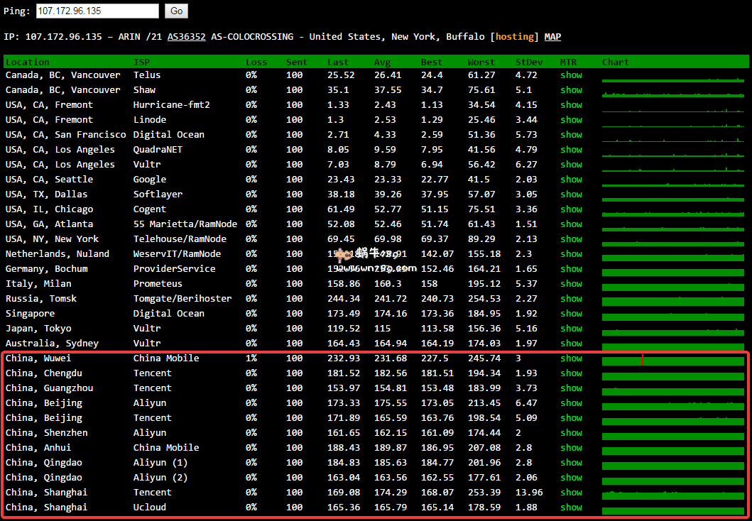 | 16 | 107.172.96.130 | 107-172-96-130-host.colocrossing.com | 美国加利福尼亚州圣何塞 colocrossing.com | AS36352 | 191.1 / 186 / 242.3 |