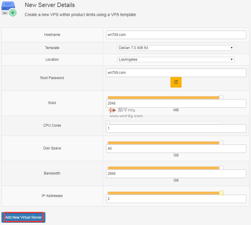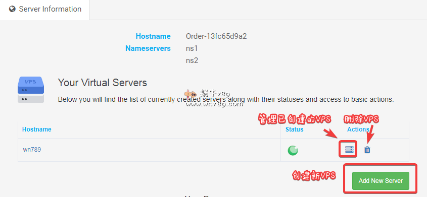 下面首先说下开通后如何创建VPS,其实很简单,按下面操作即可。首先通过客户管理页面进入到VPS管理页面,如下图点击“Add New Server”创建一个新VPS。