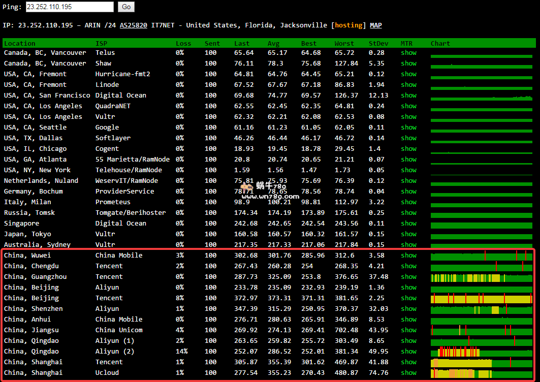 2、高品质美国CN2新泽西VPS抖动及丢包测试。红框以上的节点测试结果显示都还不错,适合北美、欧洲地区用户,到亚太地区勉强也还可以,就是到中国大陆速度欠佳。