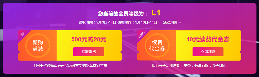 领取时间:9月3日-14日 使用时间:9月10日-14日,用户可通过活动页面领取新购满减资格,新购满减的优惠幅度按其会员等级确定,L0-L1会员:新购满500减20,L2会员:新购满3000减150,L3会员:新购满12000减700,L4会员:新购满30000减2000。续费代金券的规格按其会员等级确定,L0-L1会员:可领10元续费代金券,续费金额满200元可用,L2会员:可领100元续费代金券,续费金额满2000元可用,L3会员:可领500元续费代金券,续费金额满10000元可用,L4会员:可领1000元续费代金券,续费金额满20000元可用。