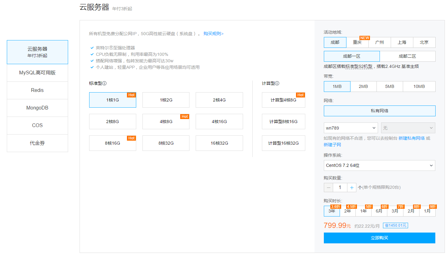 热卖云产品3折起是腾讯云目前关于国内云服务器的给力促销活动,所有云服务器产品采用英特尔Ⓡ至强处理器、CPU负载无限制,利用率最高为100%、搭配网络增强,包专线能力最高可达30w、适合个人建站,轻量APP,企业用户等各应用场景、所有机型免费分配公网IP,50G高性能云硬盘(系统盘)。腾讯云官网已注册且完成实名认证的国内站用户均可参与。有成都、重庆、广州、上海、北京五个节点可以选择,带宽有1Mbps、2Mbps、5Mbps、10Mbps可以选择。其中成都节点最为实惠,1核1G内存1Mbps带宽三年只需799元,1核1G内存2Mbps带宽三年只需1030元,1核1G内存5Mbps带宽三年只需1875元,可以说是超值,并且还适合需要较大带宽的朋友。下面列举了1核1G内存、1核2G内存、2核4G内存及1Mbps、2Mbps、5Mbps带宽三款配置,建站使用一次性推荐一次性购买三年,配置建议1核2G内存起,推荐2核4G内存方案,至于带宽方面推荐5Mbps,使用三年是毫无压力的,后续应该无需另外花钱升级。如果需要更高级方案请店家下面购买链接到活动页面查看。