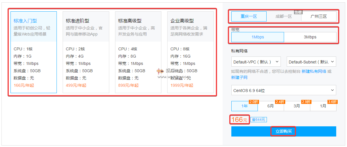 以下云服务器采用全新AMD EPYC霄龙处理器,一共4个方案,每个用户每个配置限购4台,1Mbps带宽方案最低166元/年起,3Mbps带宽方案最低249元/年起,性价比超高。一般建站使用的话1核1G内存配置就够用了,流量较大的站点推荐2核4G内存5Mbps带宽方案、年付799元/年。以下方案并不是只有1Mbps、3Mbps带宽可以选择,根据不同的配置,最高可以选择15Mbps带宽哦。