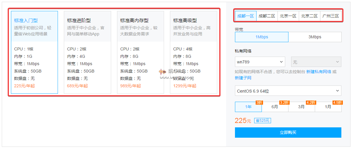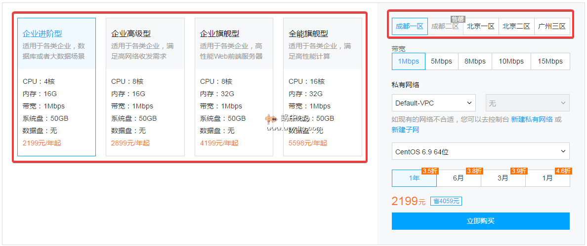 采用英特尔至强处理器,相对于AMD EPYC霄龙处理器计算能力更强,最低配置1核1G内存1Mbps带宽225元/年、1核1G内存3Mbps带宽360元/年。根据不同配置,最高可以选择8Mbps带宽。推荐方案还是2核4G内存,基本能满足绝大多企业和个人的建站需求。每个用户每个配置限购4台。