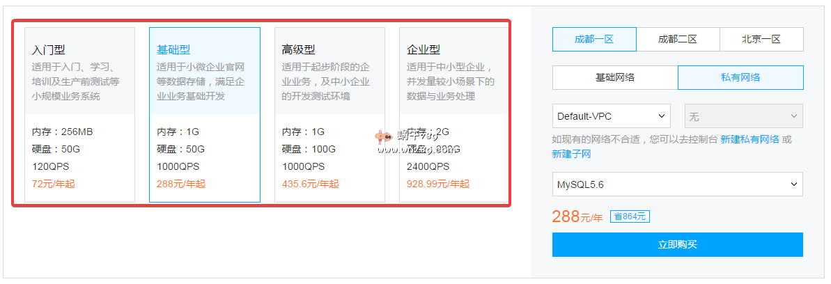 下面是云数据库MySQL促销方案,如果是购买较低配置的云服务器,建站使用的话建议配上一个云数据库,这样可以减轻对服务器的负担,并且数据库和站点文件分离安全系数也高一点。不过如果配上腾讯云服务器使用,一点要和云服务器选择同一区域和同一网络,可以实现内网访问数据库,速度更快。有MySQL5.5、MySQL5.6、MySQL5.7版本可以选择。